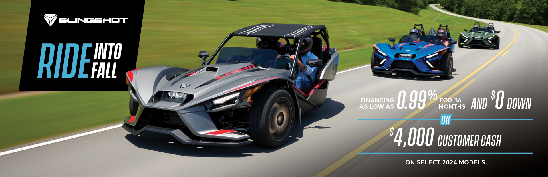 This is a limited time offer which is valid for the purchase of selected qualifying models and is subject to credit approval on qualified purchases financed during this program. Offer may not be combined with certain other offers, is subject to change and may be extended or terminated without further notice. Offer valid on new 2024 Slingshot® models (excluding S and S tech). Monthly payment and cost of borrowing will vary depending on amount borrowed and down payment/trade. Minimum amount to finance is $5,000. Example: $28,149 financed at 0.99% APR over 36 months = 36 monthly payments of $630; financed amount of $22,334 ($2,000 Customer Cash) with $2,815 down payment, total cost of borrowing of $342.51 and a total obligation of $22,676.61. An example of monthly payments required on a 36-month term at 0.99% APR is $28.20 per $1,000 financed. Monthly payment examples do not include taxes, title, and other fees. Offer only valid to qualified customers, not all customers will qualify, other offers available, see dealer for details. Offer Valid: September 1 – 30, 2025